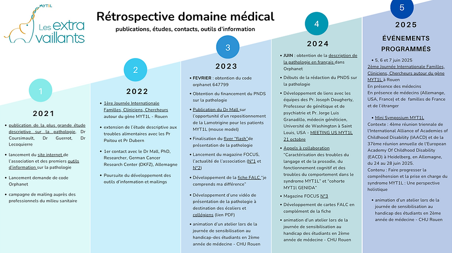 2ND INTERNATIONAL DAY AROUND THE MYT1L GENE - JUNE 2025, after a first day: Patients, Clinicians, Researchers carried out in November 2022, available on Youtube, in collaboration with the teams of the Rouen University Hospital, the doctors in clinical genetics Dr Guerrot and Dr Coursimault of the Rouen University Hospital, the AnDDi-Rares health sector and the Extra-Vaillants MYT1L. Continuation of these days ideally every 2 years.